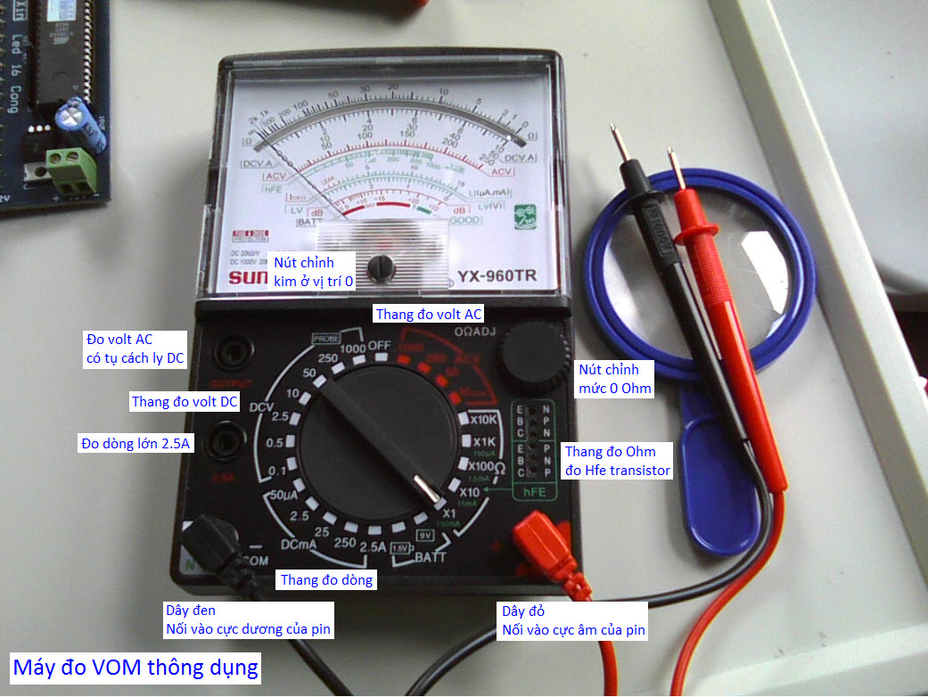 Hình trên cho thấy các thành phần cơ bản của một máy đo VOM. Quy trình dùng máy đo như sau: