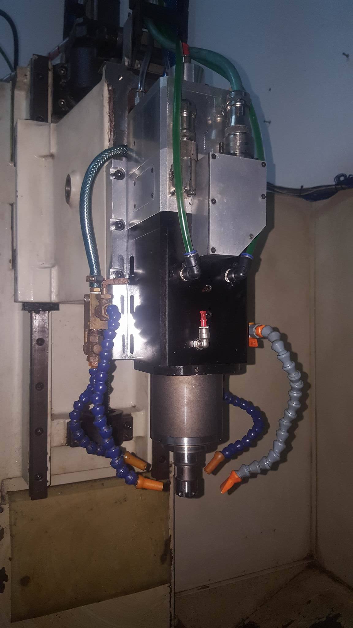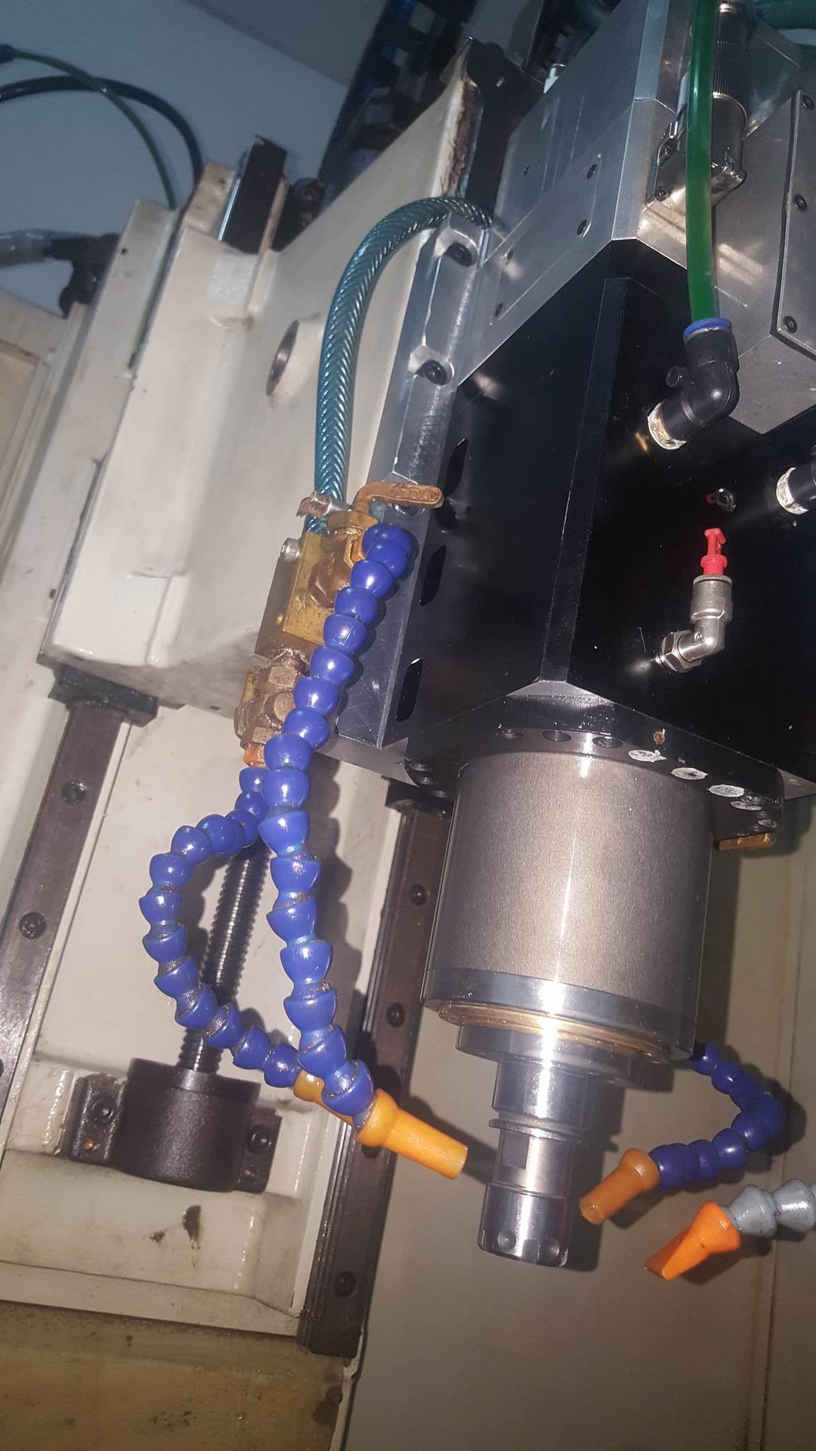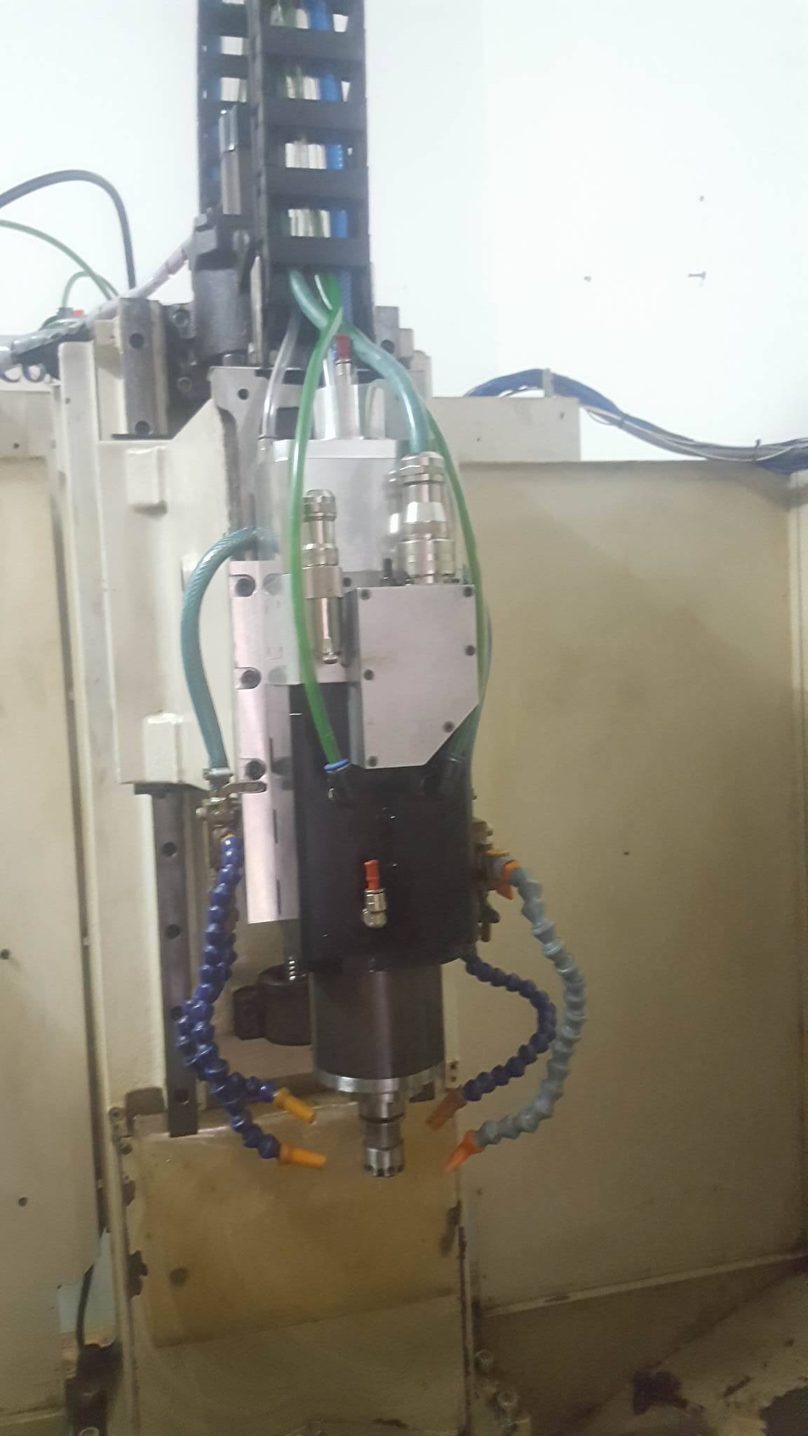 - sau đó phay phả mặt lại, cũng may là bệ z có 2 gờ định vị mép block, em hạ dao xuống rà cạnh rãnh bàn T sau đó áp cái gờ định vị vô đó siết cứng. Phả xong đặt con spin lên ướm.