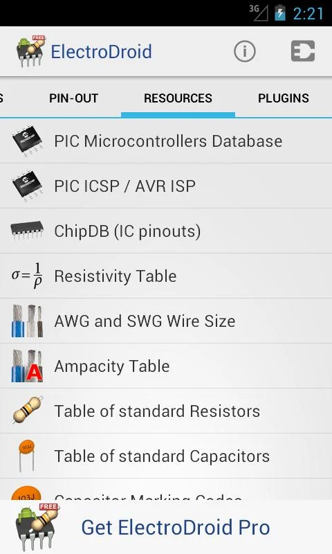 • Resources (Resistivity table; Table of standard resistors and capacitors; Capacitor marking codes; AWG and SWG Wire size; Ampacity Table; Symbols and Abbreviations; Circuit Schematic Symbols; SI Units prefixes; Battery info; Boolean logic gate and algebra Theorems; 7400 info and pinout; ASCII codes, Batteries list, 78xx IC, ChipDB IC pinouts, Switch Information, Decibel Table, PIC ICSP/AVR ISP, SMD Package Size, Radio frequencies);